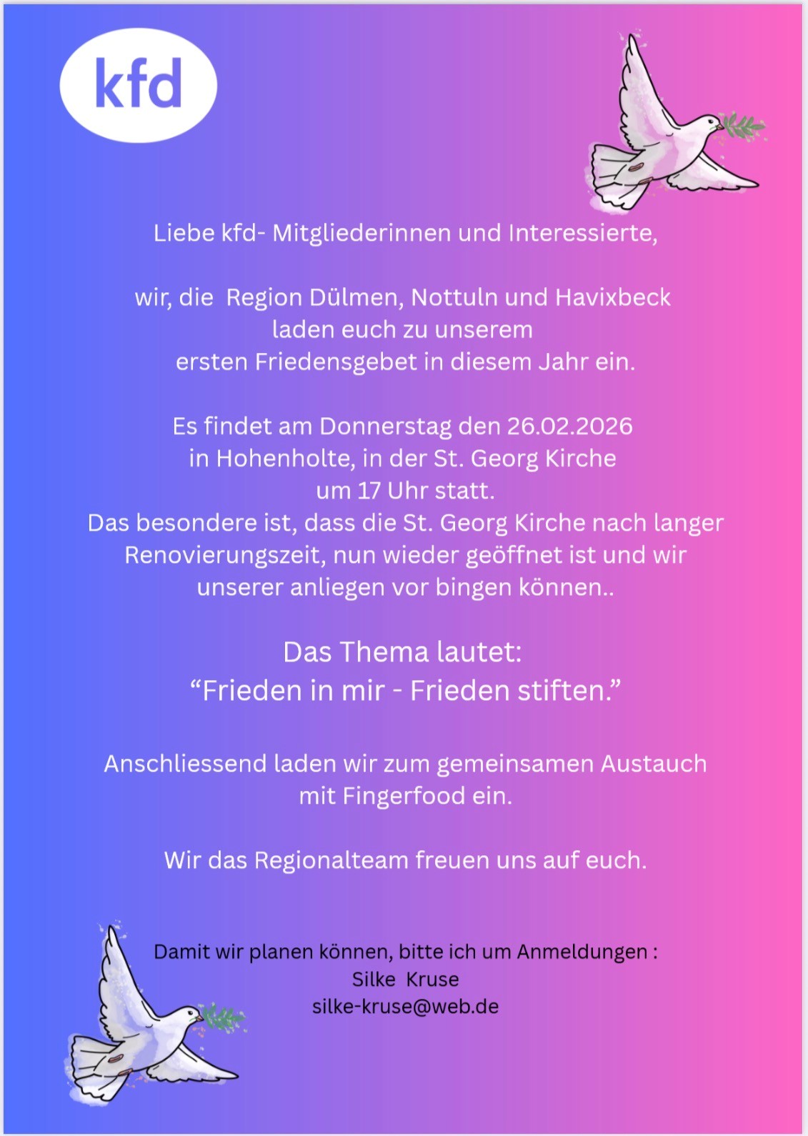 St. Georg Hohenholte Auf dem Stift 31, Havixbeck-HohenholteFahrgemeinschaften können gebildet werden, meldet euch beim kfd-Team Appelhülsen! Treffen um 16:30 Uhr am Parkplatz Schulze Frenkings Hof.