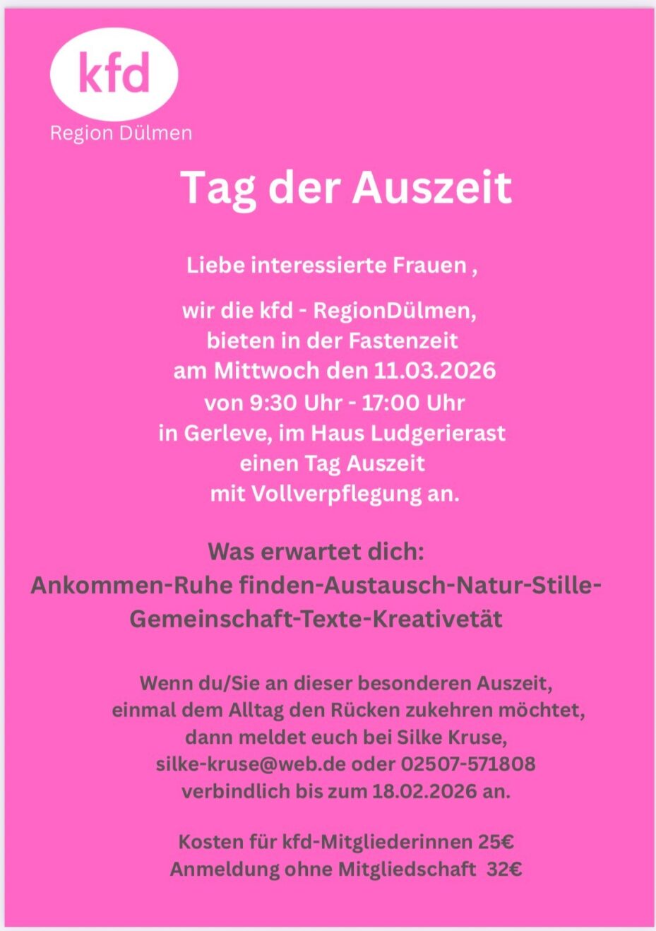 Der Weltgebetstag findet in diesem Jahr ab 17:00 Uhr in Schapdetten statt. Fahrgemeinschaften können gebildet werden, meldet euch beim kfd-Team Appelhülsen! Treffen um 16:45 Uhr am Parkplatz Schulze Frenkings Hof.