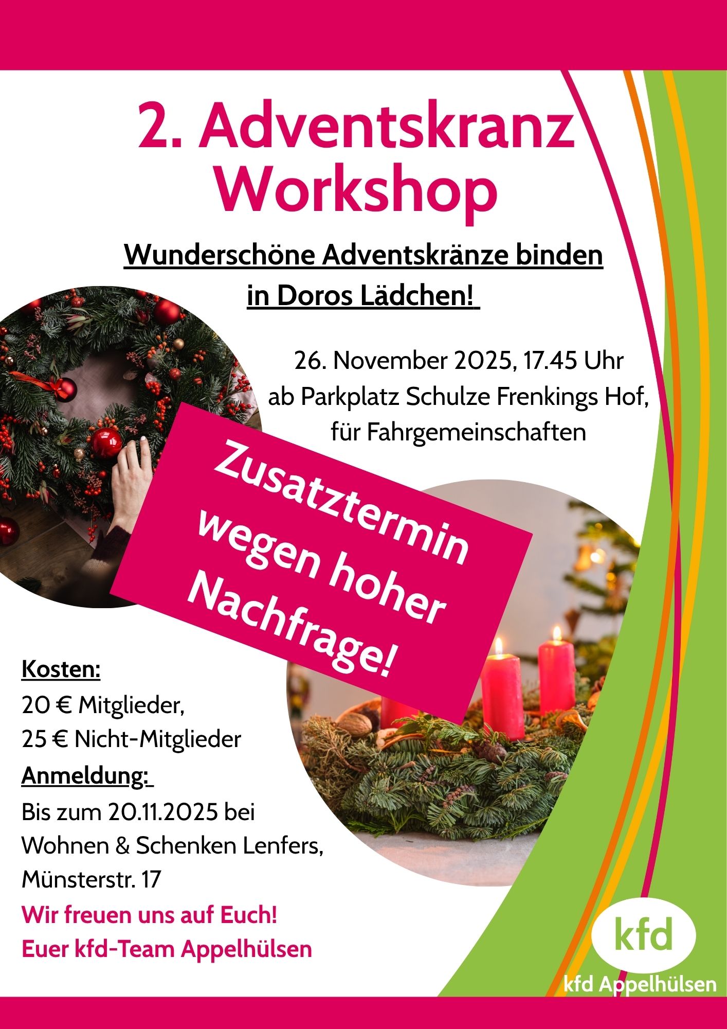 Aufgrund von eurem großen Interesse haben wir einen zweiten Termin vereinbart! Gemeinsam mit Doro binden und dekorieren wir individuelle Advents- oder Türkränze, quatschen und verbringen einen schönen Abend! Wir treffen uns um 17.45 Uhr am Frenkingshof und bilden Fahrgemeinschaften um nach Schapdetten zu fahren. Mitglieder 20 € / Nichtmitglieder 25 € |